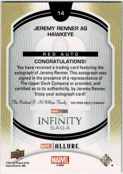 / マーベル ホークアイ ジェレミー・レナー 22 UD Marvel Allure 直筆サインカード